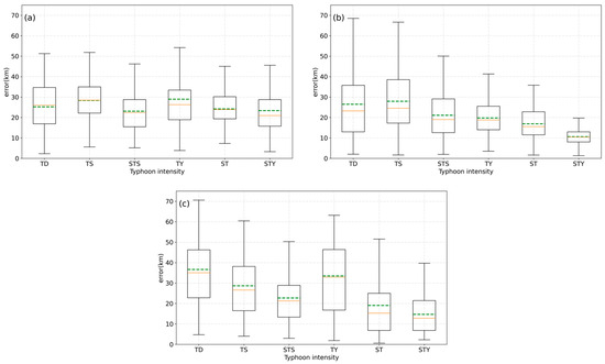 The error analysis of different typhoon localization methods under various typhoon intensities. Panel (a) illustrates the error analysis for STC SIFT at different typhoon intensities; panel (b) shows the error analysis for BTP typhoon localization under varying intensities; and panel (c) depicts the error analysis for BTP localization without parallax correction across different typhoon intensities. The orange line represents the median error, while the green dashed line indicates the mean error. The top and bottom edges of each box correspond to the upper and lower quartiles of the error distribution, and the whiskers denote the maximum and minimum error values.