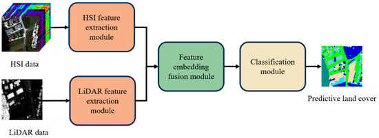 Depending on the sensor types of remote sensing data, multi-source remote sensing data can be categorized as homogeneous data or heterogeneous data [8]. HSI-LiDAR data are heterogeneous remote sensing data that contains two forms of characteristics, namely spatial–spectral features in the HSI and spatial–elevation features in the LiDAR data [9]. Depending on the hierarchical level of data fusion, multi-source remote sensing joint classification techniques can be further categorized into pixel-level, feature-level, and decision-level approaches [10]. Due to the vast variation in the target characteristics being observed, the joint HSI-LiDAR data fusion is frequently processed by feature-level or decision-level techniques. In general, a typical HSI-LiDAR fusion classification network consists of four components, including the HSI feature extraction module, LiDAR feature extraction module, feature embedding fusion module, and classification module, which is shown in Figure 1.