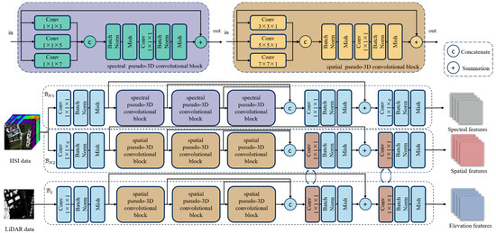 For and , the structure of the network is almost identical. The only difference is that uses convolutional layer to reduce the spectral size and increase the number of feature maps, and use convolutional layer to achieve the same function. After that, three spatial convolutional blocks are used to extract spatial and elevation features from HSI and LiDAR data. Two convolutional layers are used to encode the features and exploit the correlation and complementarity by parameter sharing, which can enhance the generalizability and robustness of the neural network. Residual and one-shot aggregation are used to enhance the convergence. Batch Norm and Mish are applied after these layers. The process of is expressed as follows.