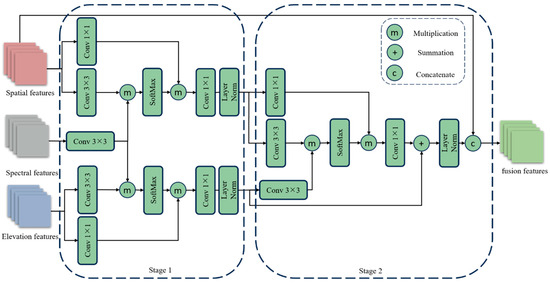 Specifically, the input’s spatial features (), spectral features (), and elevation features () are extracted by SESM. The shapes of the three features are , which are obtained by removing the spectral dimensions through the reshape operator. The whole process consists of two stages. For stage 1, spectral features are fused with spatial features and elevation features by cross attention mechanism, respectively; convolutions are used to capture local contextual information of feature maps; convolutions are applied to replace the traditional FFN to achieve linear transformation, which can effectively reduce the computational complexity. The initiation process is expressed as follows.