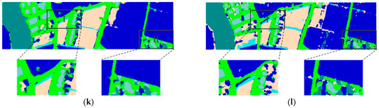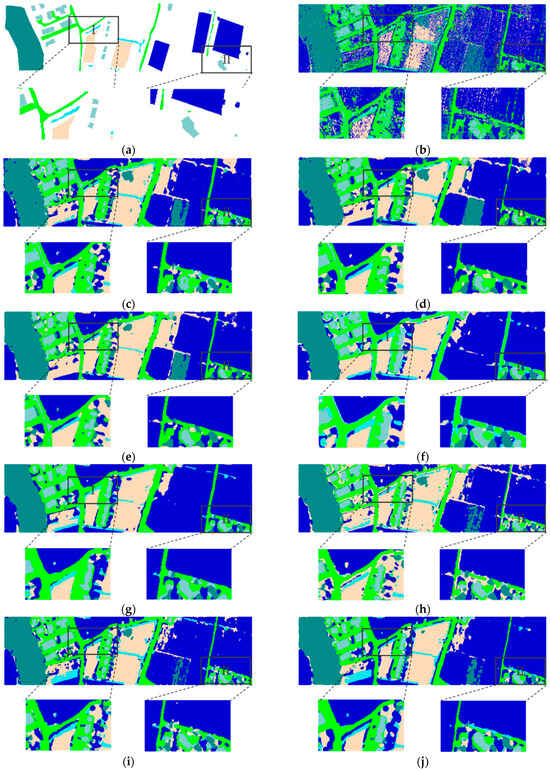 MUUFL Dataset [65]: The MUUFL dataset was collected by the ITERS CASI-1500 sensor in November 2010 at the University of Southern Mississippi Gulf Park campus in Long Beach, Mississippi, which contains the HSI dataset and LiDAR dataset. The spatial size is , and the spatial resolution is . The HSI contains 64 available bands in the range of 375 to 1050 . The LiDAR data can reflect the height of the ground objects. The land covers are classified into 11 categories, including Trees, Mostly grass, Mixed ground surface, Dirt and sand, Road, Water, Building Shadow, Building, Sidewalk, Yellow curb, and Cloth panels. The pseudo-color image for the HSI data, the LiDAR DSM image, and the ground-truth map are shown in Figure 6. The classes, colors, and the number of samples for each class are provided in Table 9.