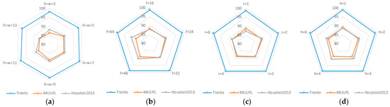 In the attention mechanism, is the target of the query, is the key feature representation, and is the value of the key feature representation. First, the attention scores are obtained by the correlation between and , which can be used to express the dependency of and . Then the output is produced by weighted summation of according to the attention scores. In the calculation process of the attention mechanism, is the subject of the query and is the core information that generates the attention scores. For the joint HSI and LiDAR datasets, we consider that the spectral signatures provided by HSI are the core information that provides more discriminative power than spatial and elevation features, which should be given a higher priority. Therefore, in the first stage of the CAFM module, spectral features are chosen as instead of spatial features or elevation information. With this design, the spectral signatures are fully utilized. And the correlation expressions of the spectral signatures with spatial features and elevation information are obtained, respectively. Based on the same consideration, in the second stage of the CAFM module, the correlation expression of the spectral signatures and elevation information is employed as to obtain a joint expression of the spectral signatures, spatial features, and elevation information, which is treated as the final fusion features.