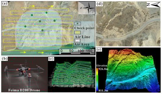 Flight route and terrain products of the UAV operation in WuLiPo: (a) planned flight plane route and checkpoint positions; (b) FeiMa D200 drone; (c) terrain-following flight route; (d) DOM; (e) 3D point cloud.