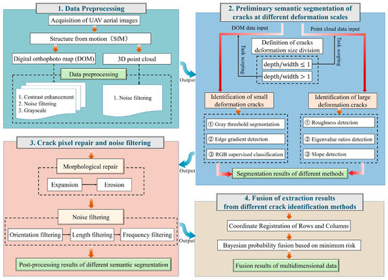 Flow chart showing the automatic landslide crack detection process utilizing multidimensional data fusion.