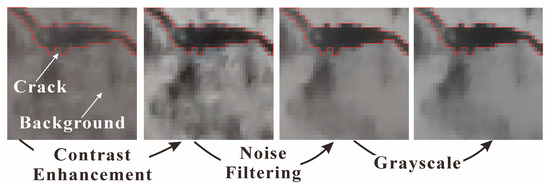 The Contrast-Limited Adaptive Histogram Equalization processing method (CLAHE) [23] is selected to enhance the image contrast. The principle of this method involves using a fixed-size matrix to collect samples covering the entire image range, setting a certain pixel frequency threshold, and then evenly distributing the regions in which the threshold is exceeded to each gray level. The block-suppressed contrast histogram equalization method increases the differences between cracks and background surfaces under different light intensities and prevents excessive noise amplification, improving the harmoniousness of the entire image. For the filtering and denoising tasks, we adopt bilateral filtering [24]. This algorithm uses 2 Gaussian filters, space and edge intensity difference, to smooth local noise while ensuring the pixel edge features are unchanged; in addition, further crack feature mining often requires only single-variable or binarized image information, so image grayscale processing is necessary. The purpose of this task is to change the crack pixel values from three channels to one channel. This process not only reduces the feature dimensions but also removes irrelevant variables. The weighted conversion grayscale value method is used to convert the three-channel RGB values into a single-channel grayscale value [25]. The above operation process is shown in Figure 5.