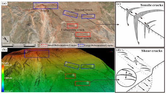 2D and 3D characteristics of landslide cracks with different scales: (a,b) the texture and morphology of the same landslide crack in the image and point cloud (the same numbered frames represent crack comparisons at the same location); (c) schematic diagram of the tensile crack formation; (d) schematic diagram of the shear crack formation. The base map of c and d is digitized from [3].