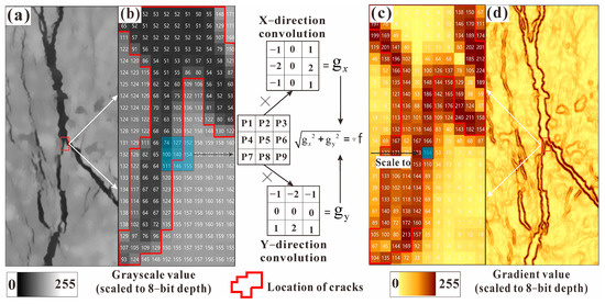 Edge detection is the process of judging whether a pixel belongs to the edge of an object by calculating the size of the gray gradient. Edge detection can be used to effectively detect the outline of an object. Therefore, in the field of computer image processing, various edge detection operators have been developed and are often used to identify cracks or abnormal objects [21]. In this research, the Sobel edge detection operator is used to extract surface cracks. The Sobel operator is a first-order derivative function, and its main principle is an edge-enhancement method that causes the extreme value to appear at the edge by weighting the adjacent gray levels in the local window [31]. In this process, two convolution kernels with a size of 3 × 3 in the horizontal and vertical directions are used to perform convolution calculations on each binary pixel; Then, Equations (6)–(8) are used to calculate the pixel gradient value () to represent the size of the edged feature. When the value is relatively large, the pixel value changes relatively fast and is biased toward the edge of the contour (as shown in Figure 8c,d):