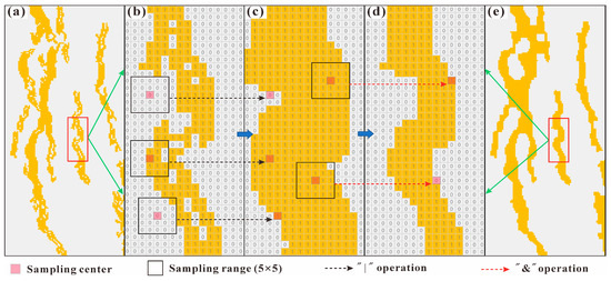 In the centers of the initially extracted crack pixel regions, a small portion of the real crack values may be misidentified, especially when using the pixel gradient model. This model can only identify crack edge features, leading to the overlook of a large number of positive samples. Therefore, the morphological closure operation method is used to repair the pixel [33]. The principle of this method involves applying an expansion morphological operation followed by an erosion operation on the extracted crack binary grid. This process fills gaps in the foreground object while maintaining the overall position and shape of the object. The main steps of this method are described as follows: (1) A fixed-size rectangular sampling frame is used to traverse each binarized pixel (as shown in Figure 10a,b). (2) Expanding pixels are identified by calculating the “|” (OR) operation of all the pixels in the sampling frame with each pixel as the center (that is, when there is at least one true value in the sample, the true value is assigned to the center point) (as shown in Figure 10c). (3) Corroding pixels are identified by performing the “&” (AND) operation on the pixels in the expanded sampling frame (that is, when there is at least one false value in the sample, a false value is assigned to the center point) (as shown in Figure 10d,e).