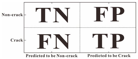 In the six crack identification models listed above, except for the supervised learning classification, all methods are pixel-oriented crack data binarization processing methods. Therefore, the results only need to pass a threshold value to complete the two-classification task to obtain crack pixels (i.e., crack and non-crack pixels). The Receiver Operating Curve (ROC) test can be used to analyze the predictive ability of a classifier under different thresholds [38]. The vertical coordinate of the curve is the True Positive Ratio (TPR), that is, the proportion of positive samples correctly predicted by the model as positive cases under different thresholds: TPR = TP/(TP + FN). The abscissa is obtained by calculating the False Positive Ratio (FPR), that is, the proportion of false positives in all inverse samples derived under different thresholds: FPR = FP/(FP + TN). The meanings of the abbreviations TN, FP, FN, and TP are shown in Figure 15.