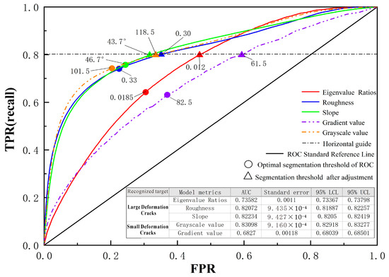 Figure 16 shows that when identifying large deformation cracks, the AUCs of the slope and roughness classification models are both above 0.8, indicating a good identification effect. The classification effect of the eigenvalue ratio model is poor. The main reason for this result is that this model is highly sensitive to uneven unidirectional changes. Consequently, it has a strong recognition effect on unclassified boulder blocks and low vegetation, resulting in its relatively low recognition accuracy. In the recognition of small deformation cracks, the grayscale segmentation model exhibited the best recognition effect, with an AUC value reaching 0.83. The pixel gradient model has a poor predictive ability, mainly because the edge gradient has an optimal recognition effect only on the boundary crack pixels, while the recognition effect on the black pixels in the middle of the crack and the surrounding regions is not optimal.