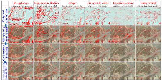 (2) Due to the influence of light angles, shrubs, boulders, and branches, there are often noise points in the identification of cracks, which can mislead people’s judgment of the instability characteristics of the landslide. The morphological repairing and filtering algorithm proposed in this research could effectively reduce the background noise of cracks and improve the overall accuracy of the applied models. Based on morphological repair and orientation, frequency, and length filtering tasks, which could sufficiently remove complex noise points (thus reducing the FPR value) and minimize the loss of real cracks (thus reducing the TPR as much as possible), the precision of each model increased by 7.5–55.3%, making the crack identification results more realistic and reliable.