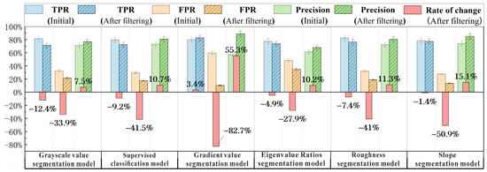Statistical chart of TPR, FPR, and precision metrics of the crack extraction models before and after repair filtering.