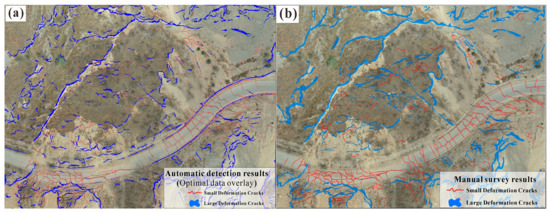 Crack identification results of Wulipo: (a) automatic detection results of gradient value segmentation and slope segmentation model; (b) manual investigation results.