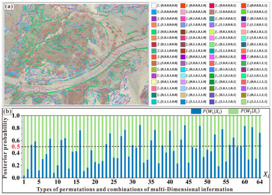 (4) According to Equation (9), the Bayesian posterior probabilities and of different classification results () under the condition of each feature combination are calculated; the results are shown in Figure 21b.
