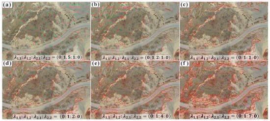Bayesian probability fusion results derived under different risk factors: (a–f) are the results of crack fusion recognition when = (0:1.5:1:0), (0:1.2:1:0), (0:1:1:0), (0:1:2:0), (0:1:4:0), and (0:1:7:0), respectively. The red areas in the image are the identified crack pixels.