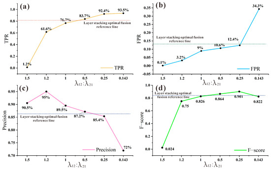 Changes in model evaluation indicators under different risk ratios based on Bayesian probability fusion: (a–d) represent the changes of TPR, FPR, Precision, and F-score under different , respectively.