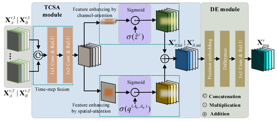 It is critical for RSICC to obtain the difference information reflecting change regions. The TCSA-based difference encoder is designed to obtain the highly discriminative features between diffusion feature pairs. As shown in Figure 2, it is composed of two components: a time-channel-spatial attention (TCSA) module and a difference encoding (DE) module.