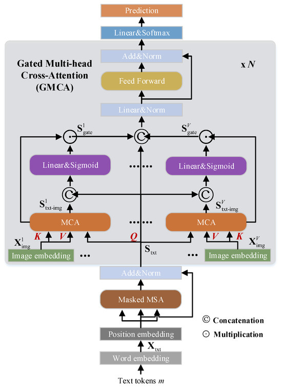 At the training stage for the sentence generation, we first transform the original text tokens m into the word embeddings , which serve as inputs of the decoder, with M denoting the sentence length and being the dimension of words embedding. Then, the masked multihead self-attention (MMSA) with the head number of H is formulated as