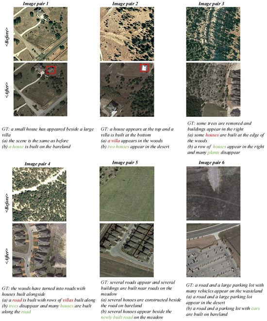 To verify the availability of the change captions from our developed MADiffCC framework, a qualitative assessment is conducted via choosing several representative cases in the LEVIR-CC dataset. The change captioning results are as shown in Figure 4, where the ground truth (GT) caption and the descriptions generated by (a) Chg2Cap [14] and (b) the proposed MADiffCC model are presented. Words in green represent more precise and detailed predicted change objects by our method, while the red text indicates an inaccurate representation. It is obvious in Figure 4 that the results achieved by our developed approach are able to describe the RS image pairs more precisely and accurately when compared with the benchmark ones. For example, as shown in Image Pair 1, MADiffCC demonstrates sensitivity to the small object “house” on the bareland, whereas the benchmark method cannot predict it. In addition, as presented in Image Pair 2, our method is able to accurately recognize “two houses” in the desert (marked in green) rather than just “a villa” obtained by the benchmark method (highlighted in red), demonstrating its capability of simultaneously recognizing multiple changes of the objects. Furthermore, it is seen in Image Pair 3 that MADiffCC can provide more informative descriptions shown in (b) compared with the results of the benchmark method given in (a), where the description “many plants disappear” is given besides the “houses”. The case in similar in Image Pairs 4, 5 and 6. The results presented in Figure 4 demonstrate that MADiffCC can generate more informative and accurate change descriptions in bitemporal RS images, which may contribute to its abilities of leveraging contextual information between samples captured from diffusion feature extractor, and discriminative multi-scale change information retrieved by multi-attention structures.