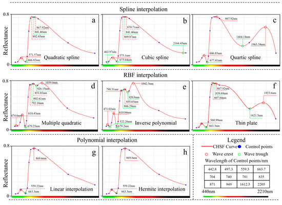 Figure 3 illustrates the challenge of “points lying on the line” and demonstrates the application of interpolation methods within the CHSF framework. The key observations are as follows: (1) Spline Interpolation: Quadratic, cubic, and quartic splines were utilized. Beyond quartic splines, the CHSF curves exhibited negative trends, deviating from the expected reflection mechanisms in grassland remote sensing. Quadratic and cubic splines shared similar characteristics, displaying multiple wave crests and troughs along their profiles. (2) RBF Interpolation: Compared to spline interpolation, RBF methods showed more pronounced wave crests and troughs across the spectral range. Multiple quadratic and inverse polynomial basis function interpolations exhibited distinct features between 470 nm and 1045 nm, while the thin-plate basis function interpolation revealed specific peaks and troughs at 1621.5 nm and 1923.6 nm. (3) Polynomial Interpolation: Linear and Hermite interpolations produced smoother curves compared to spline and RBF methods. Although smoother, these profiles still adhered to the fundamental principles of grassland remote sensing reflection.