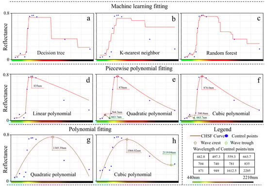 Figure 4 visually represents the “points lying off the line” problem through the application of various fitting methods: (1) Machine learning fitting: CHSF curves generated using a decision tree and K-nearest neighbor algorithms tend to be relatively simple, while random forest produces more varied results. In general, machine learning fitting lacks the distinct wave crests and troughs typically observed in spectral curves. Instead, it tends to display a noticeable step-like pattern. (2) Piecewise polynomial fitting: When the polynomial degree exceeds three, the resulting CHSF curve deviates from the expected grassland remote sensing reflection mechanisms, often falling below zero. Therefore, piecewise linear, quadratic, and cubic polynomials are applied. The CHSF curve generated by linear polynomial fitting lacks evident wave crests and troughs. In contrast, quadratic and cubic piecewise polynomial fitting produce curves with clear wave crests and troughs, concentrated in the 560 nm to 880 nm range (Figure 4). (3) Polynomial fitting: Similarly, when the polynomial degree is greater than three, the CHSF curve falls below 0, and linear fitting results in a straight line. Therefore, quadratic and cubic polynomials are selected. While these methods generate CHSF curves with noticeable wave crests and troughs, they tend to diverge from the fundamental trends in grassland spectral reflection.