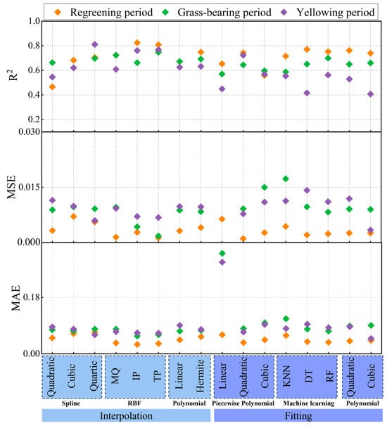 Accuracy assessment of grassland key ecological parameters inversion by using CHSF: The orange diamonds, green diamonds, and purple diamonds represent the regreening, grass-bearing, and yellowing periods, respectively. MQ, IP, and TP are the kernel function of RBF: multiple quadratic, inverse polynomial, and thin-plate. KNN, DT, and RF are the methods of machine learning: K-nearest neighbor, decision tree, and random forest.