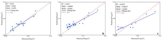 Figure 7 clearly reports the fitting results between the predicted and measured P content of our optimal models (Table 3). Outliers were removed during the plotting process. Overall, the predicted P content of all growing seasons exhibits small differences compared to the measured values.