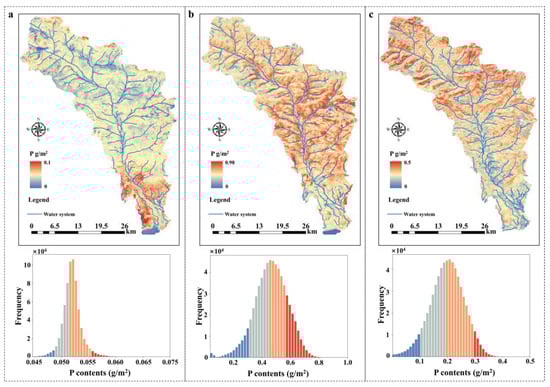 The optimal estimation model from Section 3.2 was used to map the spatial distribution of forage P content within the study area, enabling an analysis of its spatial pattern variations. Figure 8 shows the spatial distributions and data histograms of forage P content in the regreening, grass-bearing, and yellowing periods. Grasslands located near water systems exhibited significantly higher P content. Throughout the three growing seasons, the overall trend in P content followed the order grass-bearing > yellowing > regreening. In the regreening period, P content was generally low, showing a south-to-north decreasing gradient in the Shaliu River Basin (Figure 8a). During the grass-bearing period, P content rose sharply, particularly in central regions (Figure 8b). By the yellowing period, P content declined, with the highest levels in the northern part of the basin (Figure 8c).