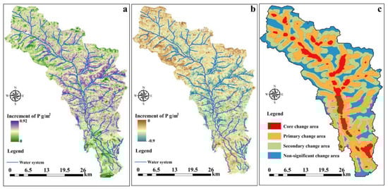 The seasonal spatiotemporal dynamics of forage P content were analyzed across the regreening, grass-bearing, and yellowing periods, revealing distinct spatial pattern variations in the study area (Figure 9). The histograms in Figure 8, generated using the natural break method, informed the final kernel density estimation threshold based on spatial distributions. This threshold delineated four distinct change areas (Figure 9c). Figure 9 clearly illustrates the changes in content of forage P across the Shaliu River Basin from the regreening to yellowing period. From the regreening to grass-bearing period, there is a noticeable increase in P content, particularly in areas closer to the water system, with the central part of the basin experiencing the most significant rise (Figure 9a). Conversely, from the grass-bearing to yellowing period, the central region of the basin shows the most substantial decrease in P content, with the decline being more pronounced in areas nearer to the water system (Figure 9b). The kernel density analysis of the water system in the Shaliu River Basin, as depicted in Figure 9c, reveals four distinct change areas. These are classified as the core change area (less than 1 km), primary (1–1.5 km), secondary (1.5–2 km), and non-significant (greater than 2 km). The order of these regions by area size, from largest to smallest, is as follows: primary > core > secondary > non-significant (Table 7).