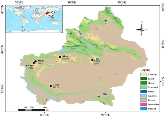 The urban agglomeration of Southern Xinjiang, centered on Kashgar, is distributed around the Tarim Basin (Figure 1), including Kashgar, Hotan, Atushi, Aksu, and Korla. These cities are the region of rapid population concentration and economic development in the Southern Xinjiang region. For example, Kashgar is located in the southwestern part of Xinjiang Uygur Autonomous Region and the western edge of the Tarim Basin, with a warm-temperate continental arid climate and four distinct seasons, covering a total area of 1056.8 km2. Hotan is located in the southwestern part of Xinjiang Uygur Autonomous Region between the Karakorum Mountains and the Taklamakan Desert, with an arid desert climate and a total area of 585.11 km2. Korla is located in the central part of Xinjiang, at the southern foot of the Tianshan Mountain and the northeastern edge of the Tarim Basin, relying on the branch of the Tianshan Mountain in the north, and facing the Taklamakan Desert, the second largest desert in the world, in the south. It is a key point of the middle road of the ancient Silk Road and one of the birthplaces of Western culture, serving as an important transportation hub and material distribution center of the North and South Xinjiang.