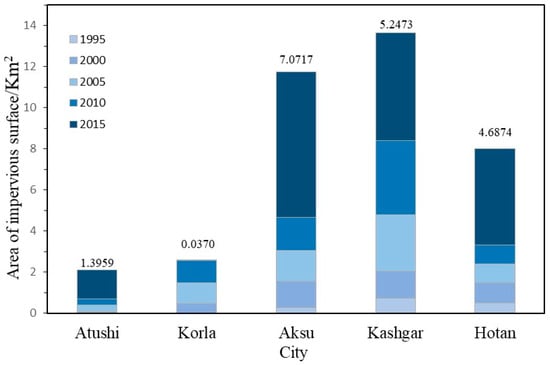 As shown in Figure 2, the impervious surfaces in the Southern Xinjiang urban agglomeration experienced a notable increase between 1995 and 2015. Figure 3 illustrates the change in the area and spatial distribution of impervious surfaces by city in 1995 and 2015. Over this 20-year period, the non-cultivated area expanded significantly, growing from 1.84 km2 to 22.95 km2. Among the regions, Aksu exhibited the largest increase in impervious surface, with an expansion of 6.78 km2, followed by Kashgar, which saw an increase of 4.51 km2. The most substantial growth in impervious surfaces occurred during the 2010–2015 period, coinciding with rapid urbanization. Therefore, it is of representative significance for urban planning in Southern Xinjiang to study the influence factors and change characteristics of the urban heat island effect in the period 2000–2015. This expansion of impervious surfaces is expected to alter the thermal characteristics of the urban environment, contributing to an increase in the intensity of the urban heat island (UHI) effect. The growing impervious surface area reduces the natural capacity of the landscape to absorb and dissipate heat, which amplifies the UHI effect and contributes to changes in the city’s thermal dynamics.