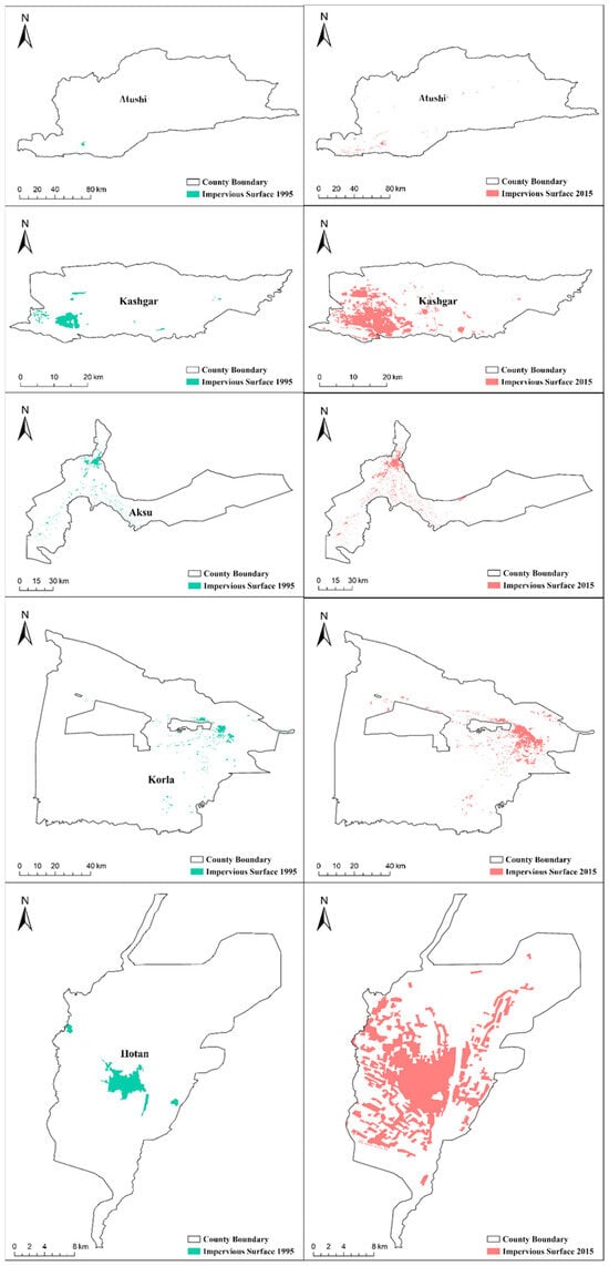 Spatial changes in impervious surface in the Southern Xinjiang urban agglomeration, 1995–2015.