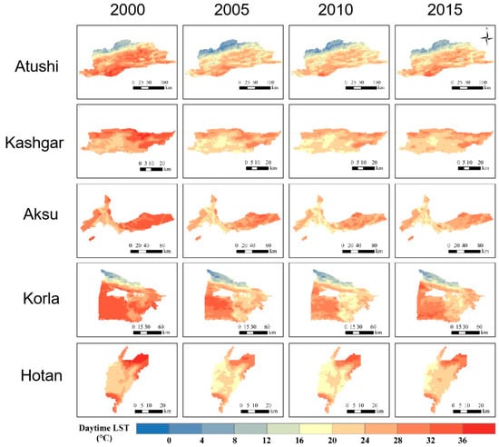 The heat island intensity in the Southern Xinjiang urban agglomeration exhibited notable inter-annual variability, influenced by changes in the impervious surface area, population growth, and other factors (Figure 8). From 2000 to 2015, the daytime UHI intensity in all cities showed an overall increasing trend, with Kashgar experiencing the most pronounced increase. Hotan consistently recorded the highest daytime UHI intensity during this period, with a sharp increase observed after 2010.