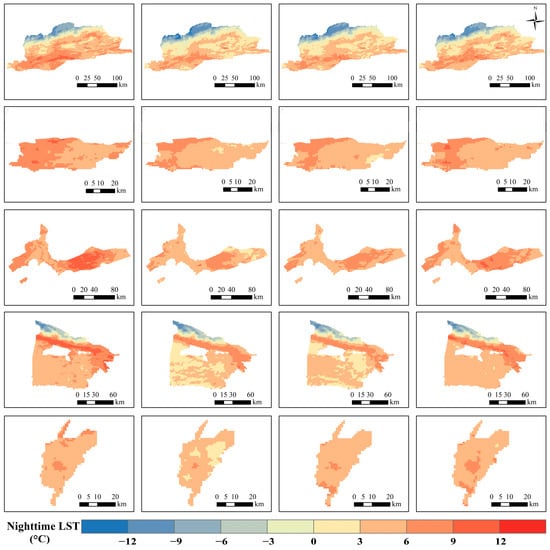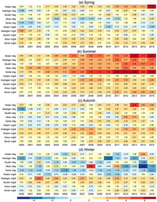 Figure 9 illustrates the seasonal changes in daytime and nighttime urban heat island intensity in the Southern Xinjiang urban agglomeration from 2000 to 2015, revealing distinct seasonal patterns across cities. These variations highlight the significant influence of seasonality on the UHI effect.