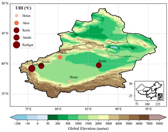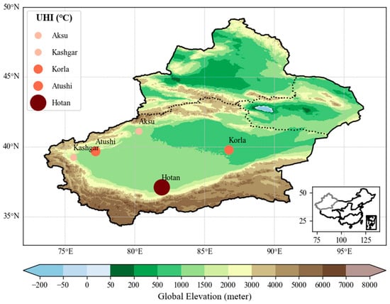 The influencing factors of the urban heat island effect are more complicated [,,]; therefore, the influencing factors of the change in urban heat island effect intensity have been a hot research issue [,]. Meteorological variables, including relative humidity, cumulative precipitation, and aerosol optical thickness have the most significant influence on the intensity of the heat island effect []. In-depth study of the influence mechanism of these factors on the heat island effect and the development of corresponding regulatory measures are of great significance for mitigating the heat island effect and improving the quality of the urban environment. Although more scholars have focused on the study of the urban heat island effect at home and abroad, there is still a large gap in the study of the urban climate effect in the Xinjiang region [], and there are only a few studies on the urban heat island in Urumqi [,,,]. There have been studies on the characteristics of urban heat island in semi-arid regions [] and spatial and temporal analyses of the urban heat island near deserts [,,]. As an important economic and cultural center in western China, the southern urban agglomeration of Xinjiang has experienced rapid urbanization in recent years. With urban expansion and population growth, the urban heat island effect has become one of the notable environmental problems facing the region. The Southern Xinjiang urban agglomeration with Kashgar as the regional center has faced more serious air pollution problems in recent years [,]; however, there are still few studies on the Southern Xinjiang urban agglomeration exploring its urban climate effect and other related issues, and there is an urgent need for studies on the heat island of the Southern Xinjiang urban agglomeration to provide the scientific basis for decision-making relating to urban construction. Therefore, it is important to study the heat island effect in the Southern Xinjiang urban agglomeration, especially its spatial and temporal characteristics and influencing factors, in order to formulate effective urban planning and environmental protection policies.