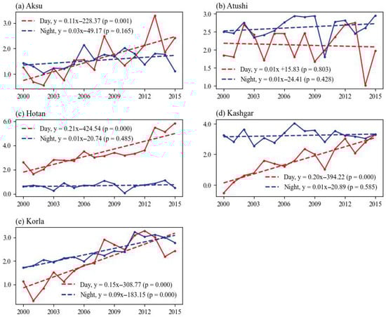 Annual variation in urban heat island intensity in the South Xinjiang urban agglomeration, 2000–2015 ((a). Aksu, (b). Atushi, (c). Hotan, (d). Kashgar, (e). Korla).