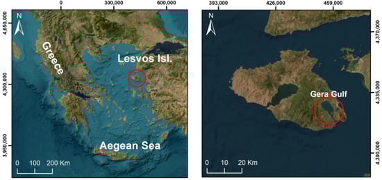 The location of the study areas (Gera Gulf) in Greece and Lesvos Island (red circle).