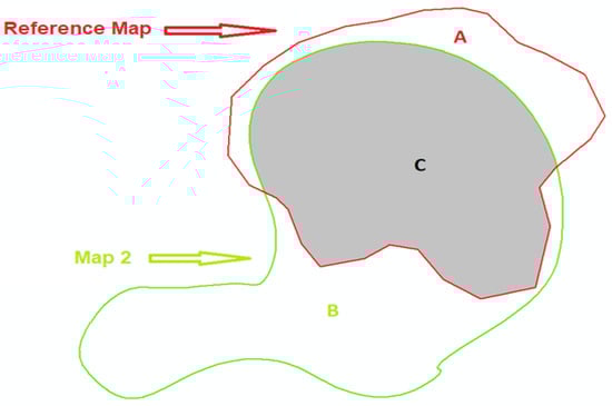 Mapcurves, a quantitative goodness-of-fit (GOF) method [], was chosen for the map (manual, BTM-B4, BTM-B4S2, CoMMa, eCognition) overlap comparison and an ArcGIS Pro toolbox was created to automate this calculation (see Supplementary Material for the script). The method presents the degree of spatial concordance between two or more maps and it is based on the degree of spatial overlap between the maps. The reference map (RF or Map 1) to which another map (Map 2) is compared determines the direction of the comparison, and the combination that produces the best degree-of-fit value is considered to be the level of similarity between the maps. The GOF algorithm (Equation (1)) is based on two values (Figure 2): (1) the proportion of the intersecting area (C) to the total area of the intersecting category from Map 2 (B + C); and (2) the proportion of the intersecting area (C) to the total area of the category from Map 1 (A + C). The first term gives the proportion of “insideness” that the reference category shares with the tested category, and itself represents a GOF term. The second term weights this degree-of-fit by the fractional share of the Map 1 category’s area that is intersected. Without that area weighting, the presence of many large intersecting categories, each one of which might share only a small spatial intersection with the category being tested, would result in a high degree of fit. Multiplying these two values, a single number for the total percentage of overlap for the reefs in each map arises. All the possible combinations were tested in order to determine the optimum one.