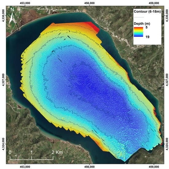 Bathymetric surveys took place in April and November 2022 using the Teledyne Reson SeaBat T20-R MBES (Teledyne Marine, Slangerup, Denmark), pole-mounted in R/V Amfitriti. The MBES comprised a TC2181 transducer, an EM7219 receiver, a Valeport mini SVS for the correct swath projection, and a rack-mounted sonar processor, which is configured with a fully integrated inertial navigation system (INS), Teledyne, Type-20. The INS uses an IMU (IP68) for motion correction (roll, heave, and acceleration measurements) and a RTK GNSS (Trimble, Westminster, CO, USA) for position, time, and high-precision navigation. The INS is fully compliant with the Applanix POS MV Wavemaster II (Applanix Corporation, Richmond Hill, ON, Canada) integrated into a T20R processor. The vessel’s speed ranged from 3 to 4 knots. An area of about 30 km2 was surveyed (~75% of the total gulf area). The system simultaneously recorded 512 beams at 420 kHz over a swath angle of up to 140°. Sound velocity profiles were collected using a Valeport SWiFT. The bathymetric data were calibrated, sound velocity profiles were applied, and any acoustic noise or artifacts were removed utilizing the Teledyne PDS software v. 4.4.4.3. A bathymetric ASCII file with 1-m cell size was exported from the PDS. The raw backscatter data were also exported with a 1-m cell size. The coordinate system of the collected data is WGS84 UTM 35N.