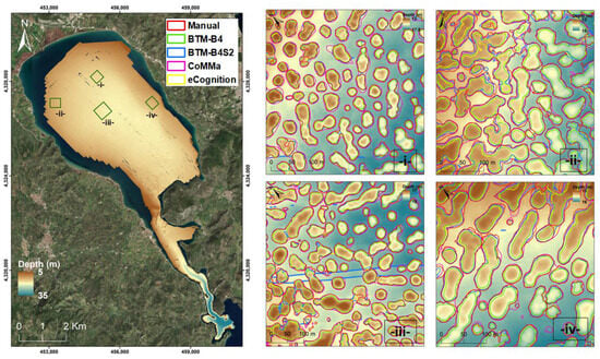 Bathymetric map of the Gera Gulf, with zoom-in areas (i–iv) showing the resulting polygons for all the methods (red polygons: manual, green: BTM-B4, blue: BTM-B4S2, magenta: CoMMa, yellow: eCognition).
