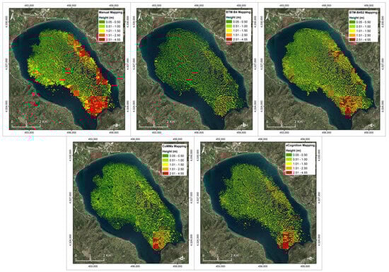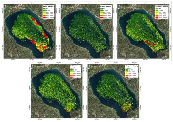 The difference in the F1 Score results from the bigger number of reefs detected using most semi-automated methods compared with the number of reefs detected manually. The reefs not detected using manual mapping but only using BTM-B4, BTM-B4S2, CoMMa, and eCognition (Figure 9) are, as indicated by their mean values, of a small area and height. Of course, there are some exceptions, especially using the semi-automated methods. These reefs are concentrated at the shallower part of the study area (around the perimeter of the gulf) and especially near the channel connecting the gulf with the open sea, where the topography becomes more complex. The total area of reefs detected using manual mapping was also detected using CoMMa and BTM-B4S2 mapping. Observing the resulting semi-automated reefs, they exhibit a fairly realistic pattern of shape, structure, and distribution, consistent with the patterns of reef development in this area of the gulf. It is therefore possible that the semi-automated methods were able to identify some reefs that the user failed to map due to the complexity of the topography.