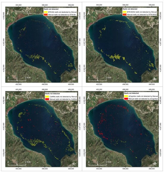 Map of the reefs not detected using (a) manual BTM-B4 mapping, (b) using manual or BTM-B4S2 mapping, (c) using manual or CoMMa mapping, and (d) using manual or eCognition mapping.