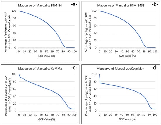 Mapcurve for GOF calculations using (a) manual as RF compared with BTM-B4, (b) manual as RF compared with BTM-B4S2, (c) manual as RF compared with CoMMa, and (d) manual as RF compared with eCognition.