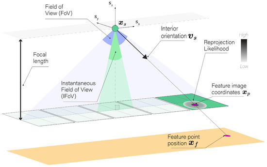 Illustration of the process of minimizing reprojection error in stereo-photogrammetry. Diagram of camera setup showing the Field Of View (FoV), focal length, and the Instantaneous Field Of View (IFoV). The internal vector and feature image coordinates are highlighted, with a color bar gradient indicating the reprojection likelihood magnitude.