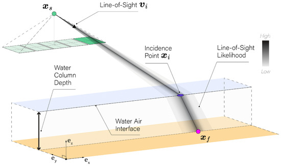 Here, represents the measured camera pose data, is a unit vector representing the feature image coordinates in the sensor frame, h is the Water–Air Interface (WAI) height, and is the modeled camera source position. Since the influence of interior orientation is disregarded in the proposed approach, the internal vector , which describes the feature coordinates in the sensor frame, is considered fixed and known posterior to feature detection and pairing. This allows it to isolate the influence of the camera pose noise on the line-of-sight and establish its spatial likelihood, as illustrated in Figure 2.