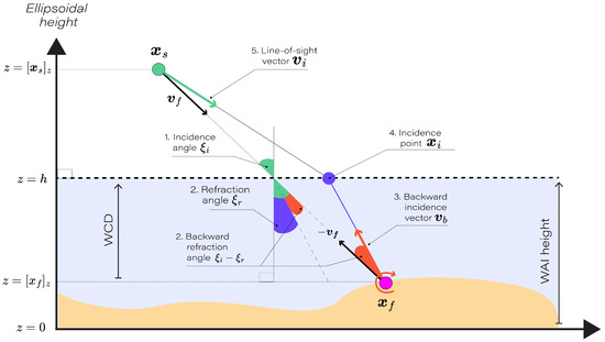 In this study, we focus on bathymetric measurements, particularly examining both the WCD and WAI height presented in Figure 3. The WCD describes the geometry of underwater environments, while the WAI marks the boundary between water and air, and its ellipsoidal height h is used for surface refraction modeling.