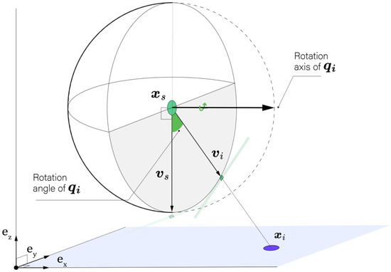 Representation of the unit quaternion and the line-of-sight vector . The quaternion rotates the camera’s internal vector to align with the incidence point . The rotation axis and angle of are indicated, illustrating the geometric transformation involved.