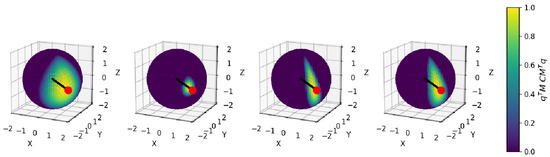 Illustration of the Bingham concentration parameter influence. The right, middle, and left spherical plots correspond to , , , and , respectively. The black vector represents the line-of-sight used to arbitrarly define an orientation matrix for the Bingham distribution. The red dot represent the incidence point . The spherical heatmap represents the non-normalized Bingham log-density: mapped to the interval for the three concentration cases.
