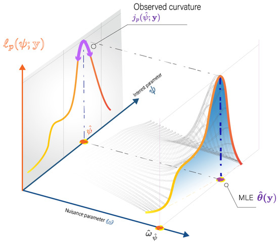 Unlike variance–covariance approaches, profiling can reveal the asymmetric behavior of CI in nonlinear setups, crucial for accurate uncertainty quantification. As highlighted in Figure 7, Wald tests result from construction of a linear slope, yielding a symmetric CI around the MLE . On the other hand, r effectively captures the asymmetric behavior that can arise in non-linear setups.