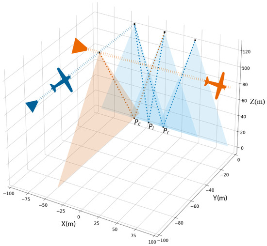 Figure 8 illustrates the camera positions (black squares) and their respective scanned FoV (blue and orange triangles) for the drone scenario. We use aFoV of 48°; a relatively extreme value to challenge our approach. To ensure comparability and consistency, the same base–height ratio determined for along-flight directions (determined by the 60% overlap constraint) is transposed to the single across-flight trajectory used for the scenario. This setup maintains a consistent geometric configuration across different orientations.